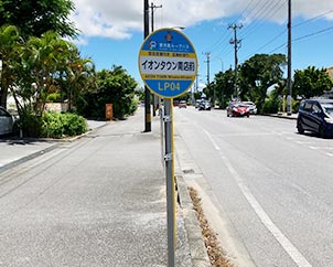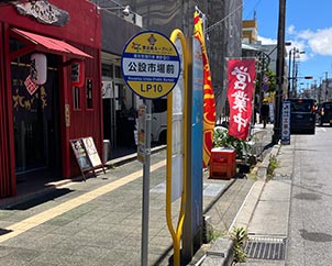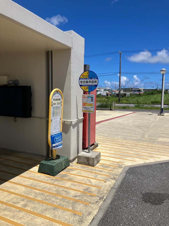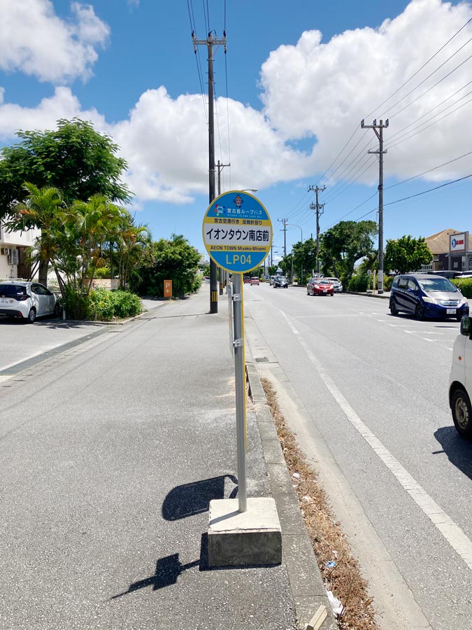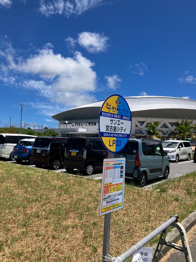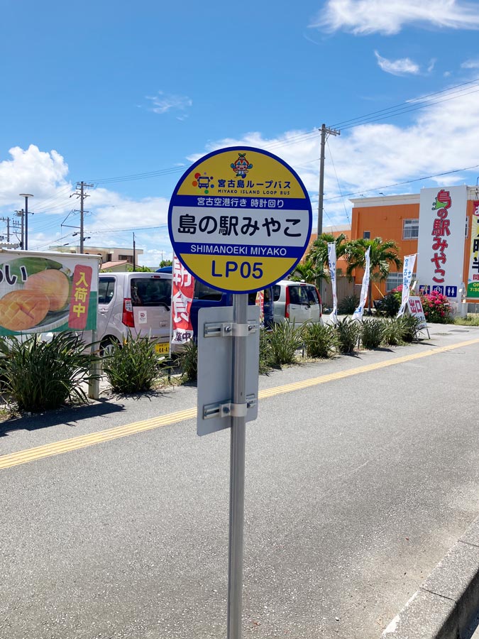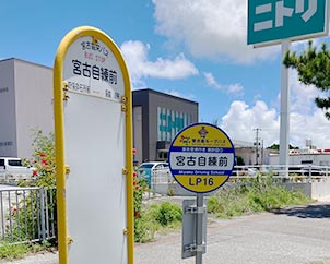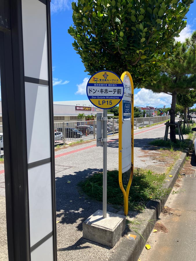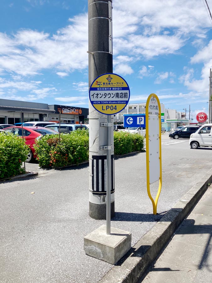 宮古島最大のショッピングセンターで、24時間営業のマックスバリュのほか、地元産の新鮮な野菜や果物が並ぶ農産物直売所「ワイドー市場」や島唯一のマクドナルド等、多くの店舗が集積しています。停留所はホテルライジングサン宮古島前にあります。
